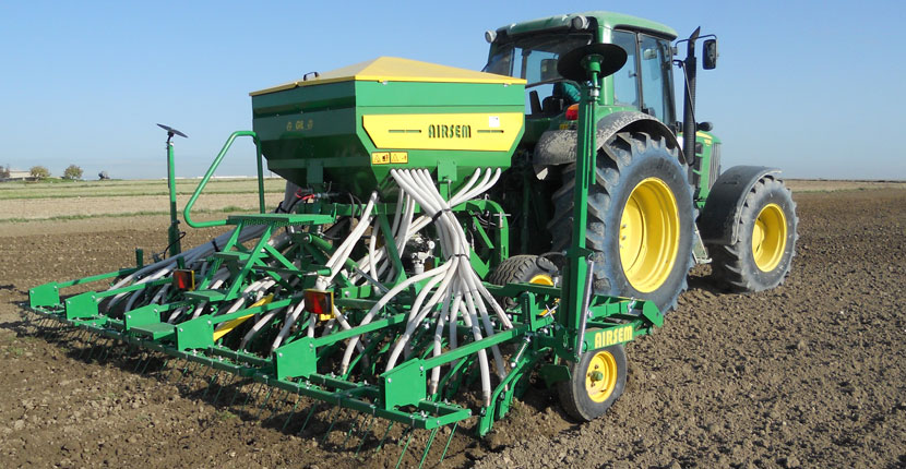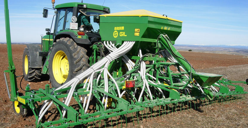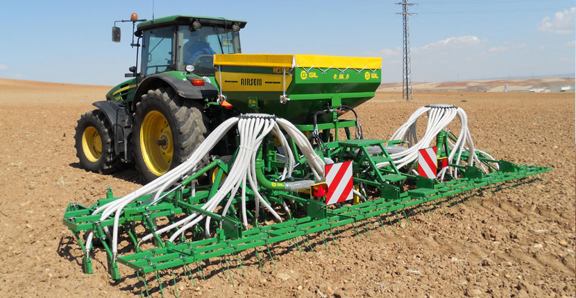 Sembradora a chorrillo neumática, chasis plegado hidráulico para el transporte, en tres cuerpos articulados para copiar el terreno. Con rastra de púas, distribuidor volumétrico de gran capacidad, borrahuellas de muelle, anulador de siembra manual, kit de luces y marcadores hidráulicos de bombines independientes. Sembradora en tres filas con control de profundidad al cuerpo central, se puede montar los tres tipos de brazos de GIL (curvo, recto y bota). Distancia entre brazos de 12,5 cm (excepto en AIRSEM-6040 y AIRSEM-7046). En los modelos Airsem-4F los brazos están distribuidos en 4 filas, para el trabajo en mayores acumulaciones de residuos. Opcionalmente se puede montar con chasis basculante.