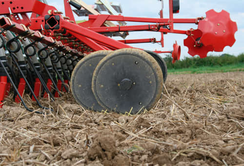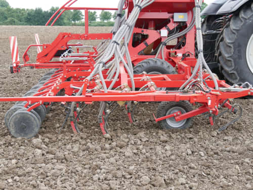 - Rejas de la ts-drill ― eficacia demostrada: La reja de siembra de ts-drill esta protegida mediante el sistema de ballesta de Kverneland. Para asegurar el trabajo de la reja sin obstrucciones en terrenos con residuos, las rejas se han dispuesto en cinco hileras. El especial diseño de la reja reduce el requerimiento de potencia y asegura la uniformidad de la deposición de la semilla, incluso en condiciones extremas de humedad y suelos arcillosos.