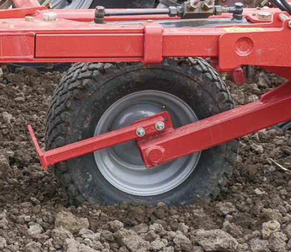 - Ruedas de grandes dimensiones Estas ruedas de grandes dimensiones 11.5/80-15.3 10PR permiten a la ts-drill trabajar fácilmente y son suavidad, con la presión ajustada a 1 bar, la marca de rodadura de la sembradora se reduce significativamente. Evitando las rodaduras también protegemos el lecho de siembra de la compactación. El ajuste de la profundidad de siembra se realiza fácilmente, disponiendo de una infinidad de posiciones.Estas ruedas permiten la libre flotación de las secciones, siguiendo las irregularidades del terreno, tanto transversales como longitudinales.